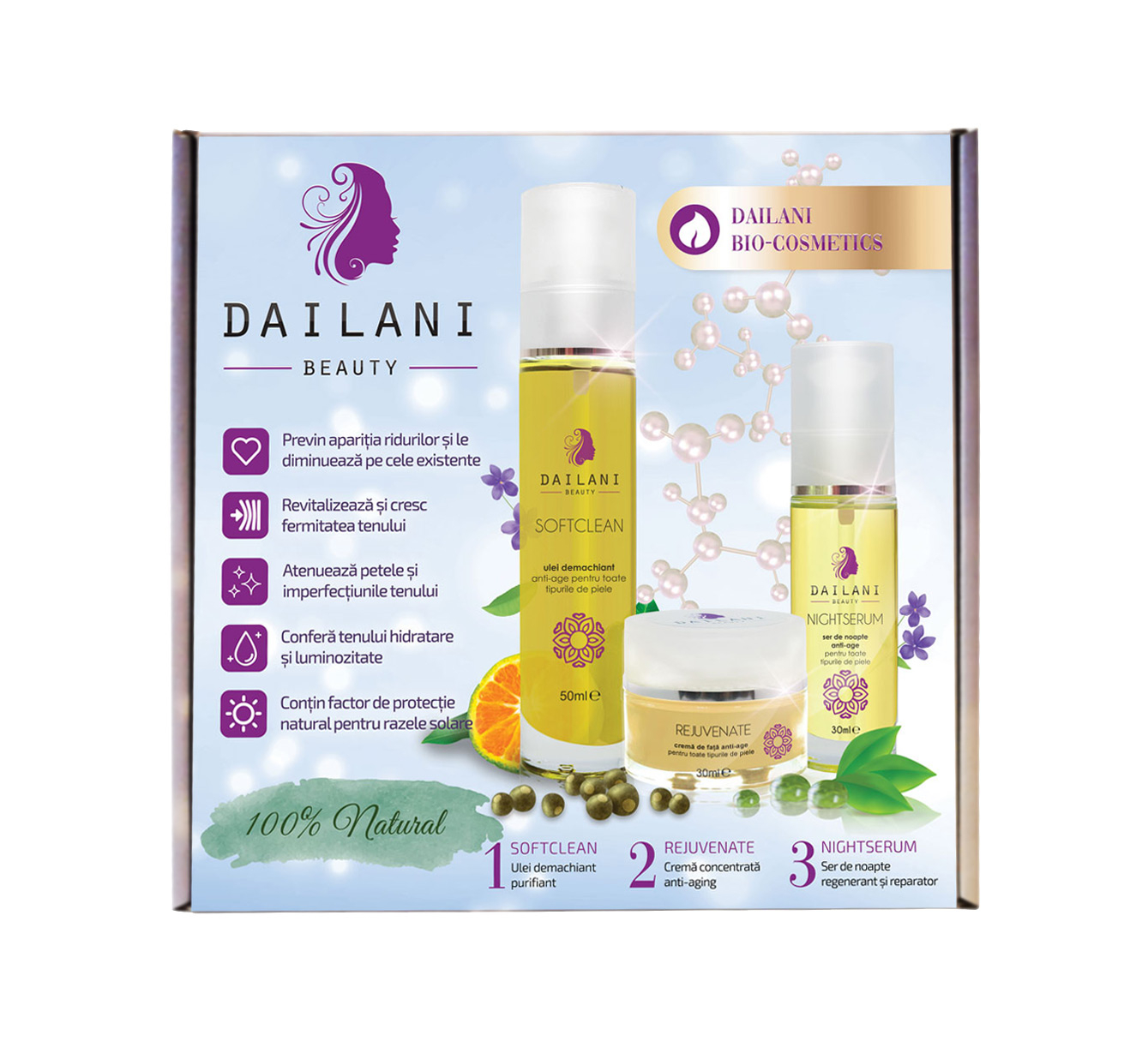⭐️⭐️⭐️ Setul de îngrijire Dailani este alegerea ideală pentru un ten sănătos și luminos. Combinația dintre ⭐️ Soft Clean – ulei demachiant, ⭐️ Rejuvenate – cremă antirid și ⭐️ Night Serum – ser regenerator oferă o rutină completă de hidratare, regenerare și protecție.